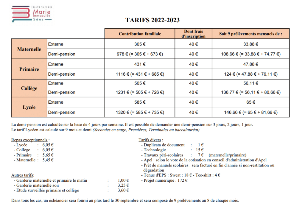 Les tarifs s’entendent pour l’année scolaire.